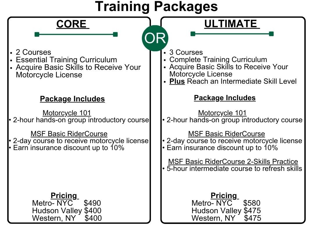 Motorcycle Safety School provides training and licensing courses for all experience levels at 7 teaching locations throughout New York State. Below is the curriculum overview depending on the individual skill set.Get Started - Packages For Beginners:
